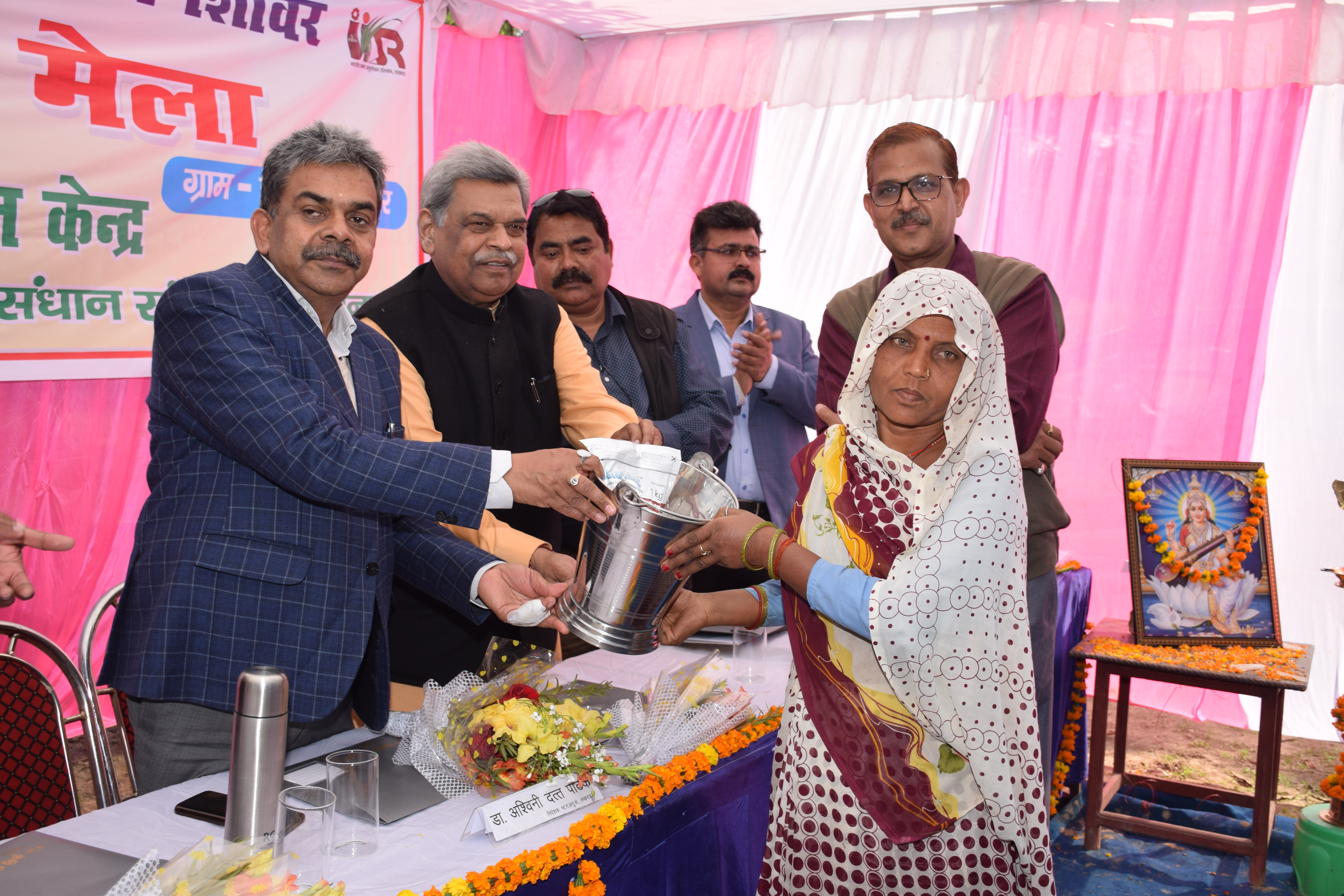 Krishi Vigyan Kendra, ICAR-Indian Institute of Sugarcane Research, Lucknow organized an Animal Fertility Camp at Ismailnagar, Nagram, Lucknow on February 18, 2020 which was attended by 365 dairy farmers and 260 animals of nearby villages for doubling the farmers’ income by increasing the productivity of dairy animals. On this occasion, Shri Umesh Singh Tomer, Chairman, Lucknow Milk Union, Lucknow Division was the Chief Guest of the programme, while Dr. A.D. Pathak, Director, ICAR-IISR, Lucknow presided the function. Total 260 livestock were medically tested for infertility and 100 kg mineral mixture, 2000 deworming tablets and medicine of ticks were distributed free of cost to the dairy owners. Dr. R.K. Singh, SMS (Animal Science) delivered a lecture on control of infertility in dairy animals and advised for balanced ration, deworming each animal at four months interval and advised farmers for green fodder/perennial fodder grasses production round the year. Three best cows and buffaloes were selected and their owners were awarded by Dr. A.D. Pathak, Director. The vote of thanks was proposed by Dr. A.K. Dubey, Head, KVK, ICAR-IISR, Lucknow.