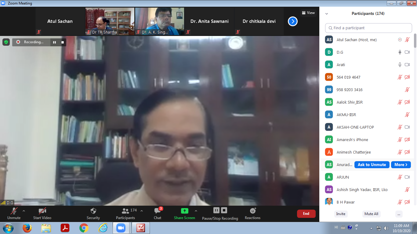 Dr A D Pathak Director, ICAR-IISR, Lucknow and Project Coordinator (S) presented the research highlights of the AICRP (S) during 2019-20 and highlighted the contribution of varietal/technolological advancements in increasing sugar production in the country.