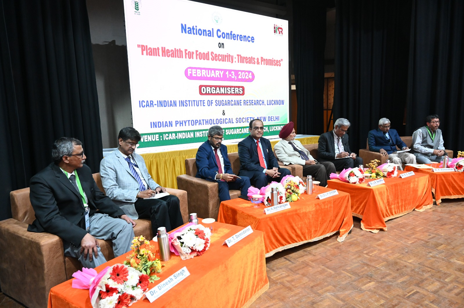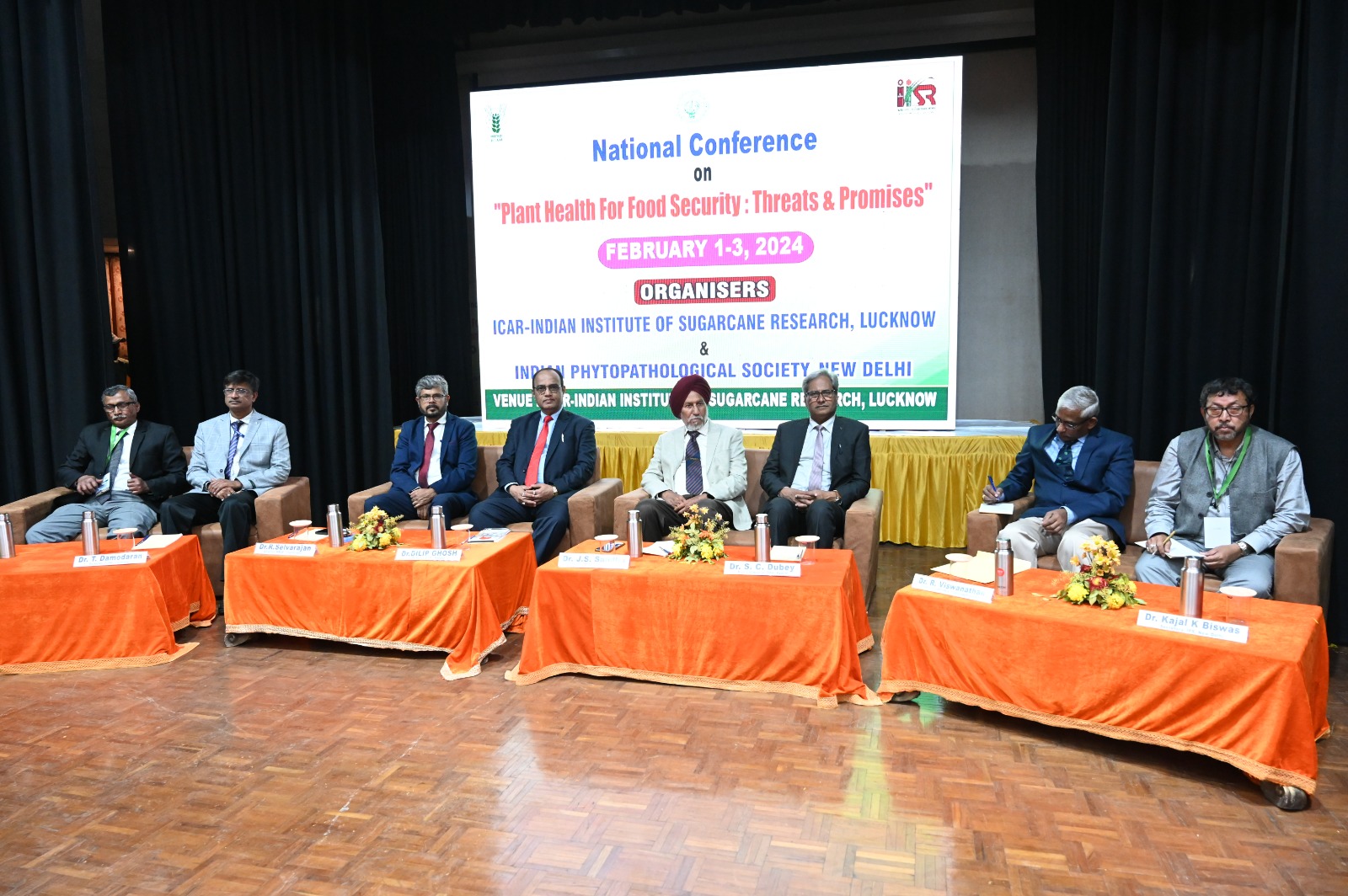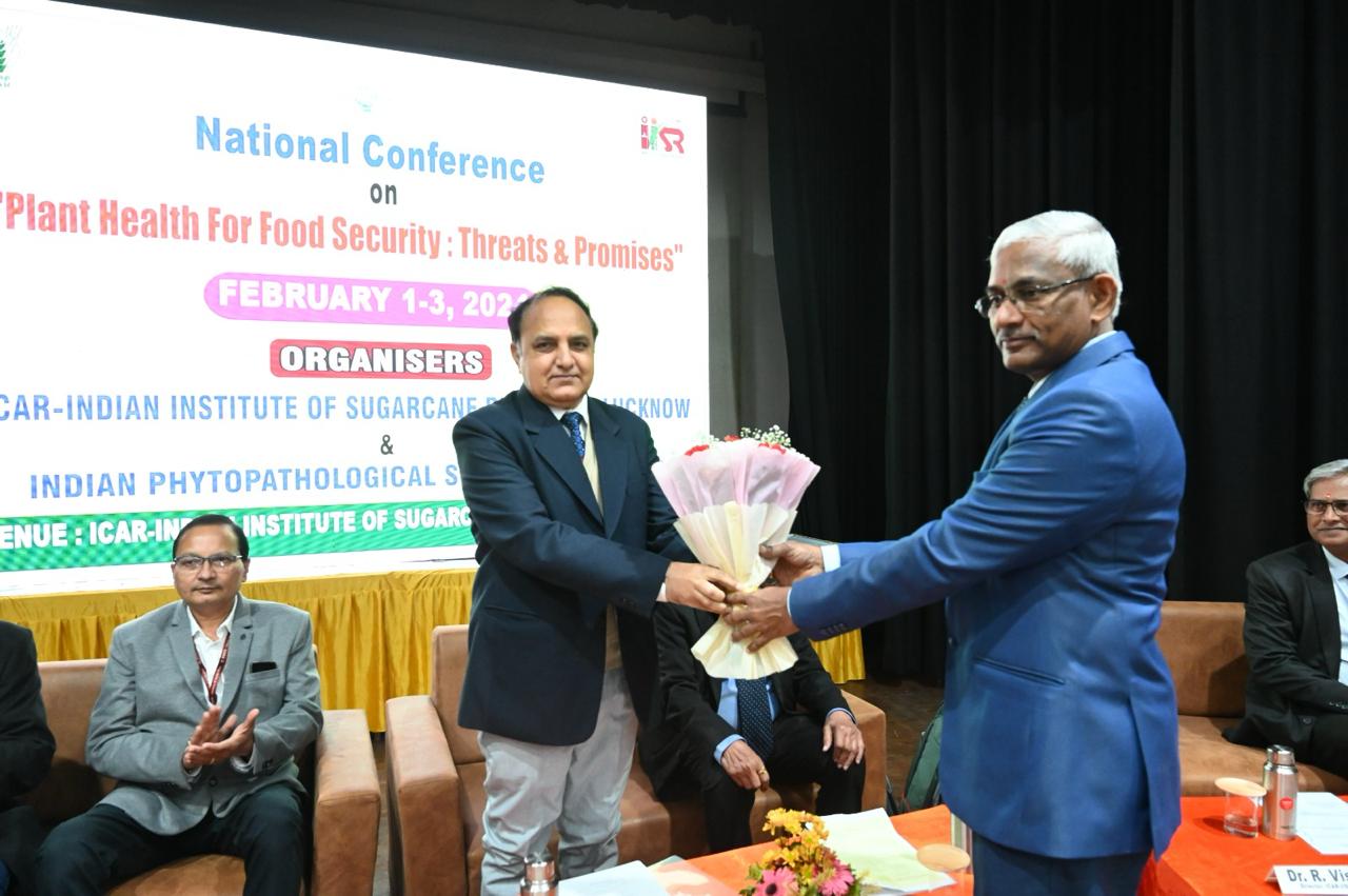 ICAR-IISR, Lucknow organized three days “National Conference on Plant Health for Food Security: Threats & Promises” at ICAR-IISR, Lucknow from Feb 01-03, 2024 in collaboration with Indian Phytpathological Society, New Delhi. The conference was inaugurated on February 01, 2024 in the presence of the Chief Guest Dr. T.R. Sharma, Deputy Director General (Crop Science) ICAR, Guest of Honour Dr. A.N. Mukhopadhyay, Ex- VC, AAU, Jorhat, Guest of Honour Dr. P.K Singh, Agriculture Commissioner, Ministry of Agriculture & Farmers’ Welfare, Govt. of India, Guest of Honour Dr. S.C. Dubey, VC, Birsa Agriculture University, Ranchi & President, IPS, Dr. Kajal Kumar Biswas , Secretary, IPS, Dr. R. Viswanathan, Director, ICAR-IISR, Lucknow & Organizing President, Dr. Dinesh Singh, Project Coordinator (Sugarcane) & Organizing Secretary of National Conference along with more than 500 participants across different states of India. The conference was inaugurated with the lighting of lamp & playing of ICAR song. At the outset, Dr. R. Viswanathan, Director, IISR, Lucknow welcomed the dignitaries and delegates & threw light on various aspects of conference. He also briefed the audience about the activities of IISR, Lucknow.