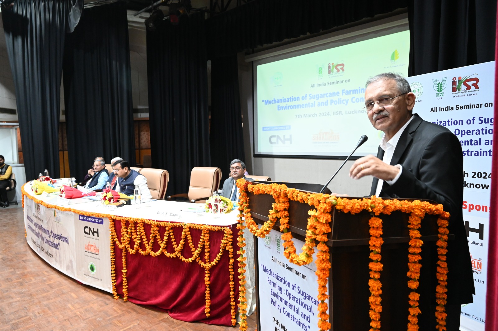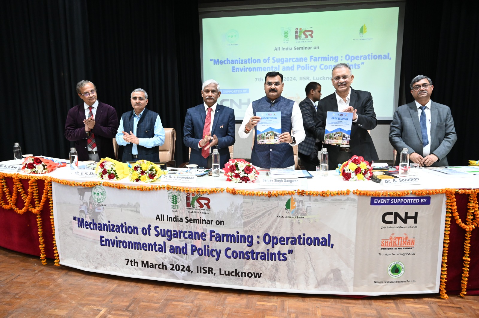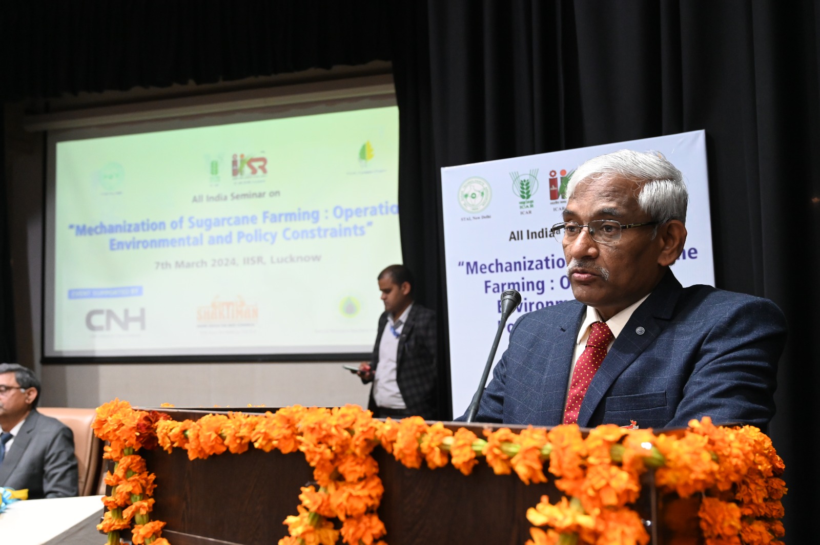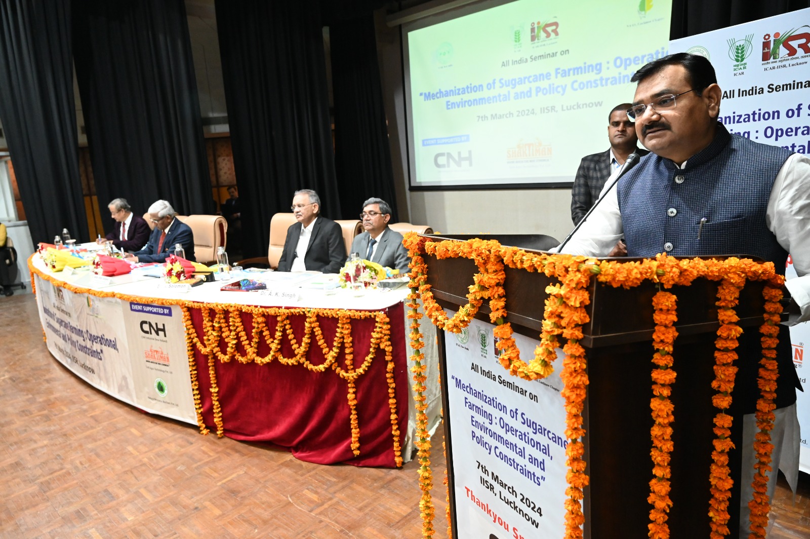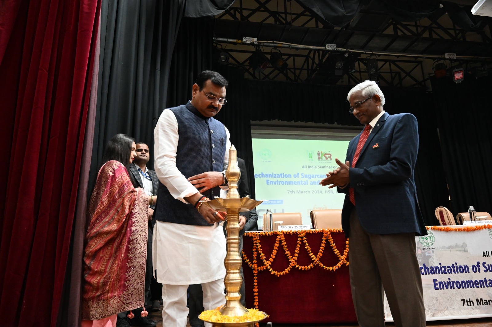 An All India one-day National Seminar on “Mechanization of Sugarcane Cultivation: Operational, Environmental and Policy Constraints” was organized by ICAR- Indian Institute of Sugarcane Research, Lucknow in collaboration with Sugar Technologists Association of India (STAI) on 7 March 2024 at Indian Institute of Sugarcane Research, Lucknow. The programme started with the Council song and lighting of the lamp. At the outset, Dr. R. Viswanathan, Director, Indian Institute of Sugarcane Research, Lucknow welcomed the Chief Guest Honb’le Shri Sanjay Singh Gangwar, Minister of State, Department of Sugar Industry and Sugarcane Development, Government of Uttar Pradesh; Guest of Honor Dr. Sushil Solomon, Former Vice Chancellor, Chandra Shekhar Azad University of Agriculture and Technology, Kanpur & Former Director of ICAR-IISR, Lucknow, and Vice President IAPSIT; Shri V.K. Shukla, Additional Cane Commissioner (Development/Research and Coordination), Sugar Industry and Cane Development Department, Government of Uttar Pradesh, all the delegates and farmers present on the occasion. He elaborated upon the achievements of IISR in the field of sugarcane mechanization and informed that the institute has designed, developed and commercialized many machineries like Sugarcane Cutter Planter, Pair-Row Sugarcane Planter, Raised Bed Seeder (RBS), Ratoon Management Device (RMD), Trench Maker, Trench Planter, Ratoon Promoter, Plant Residue Shredder, Sugarcane Detrasher etc. and has made its presence felt in the field of mechanization of sugarcane cultivation. Many of these machines were supplied to several organizations/sugar mills/farmers in different states. He apprised the audience that IISR regularly conducts 20-30 in-house trainings for extension personnels to promote technology dissemination