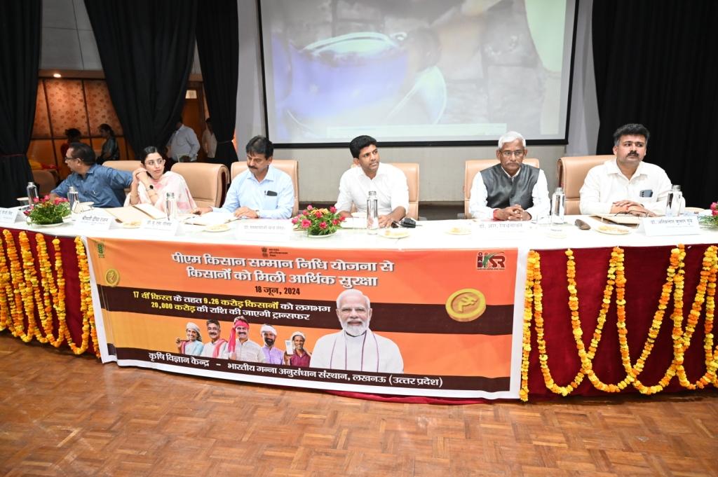 Hon'ble Dr. Pemmasani, Chandrashekhar Union Minister of State for Rural Development and Communication, Government of India presided over the live telecast program organized on the occasion of release of 17th installment of PM Kisan Samman Nidhi on 18/06/2024 at ICAR-Indian Institute of Sugarcane Research, Lucknow. Dr. U. S. Gautam, DDG (Agriculture Extension), Indian Council of Agricultural Research, New Delhi and Smt. Deeparanjan, Director, Rural Livelihood Mission, Gov. of UP were also present. On this occasion, Dr. R. Viswanathan, Director of the Institute, welcomed the guests by presenting mementos, anga vastra and bouquets. The programme was inaugurated by lighting of the lamp and ICAR song. The Director highlighted various aspects while briefing about the activities of Indian Institute of Sugarcane Research, Lucknow. Speaking on the occasion, Chief Guest Dr. Chandrashekhar Pemmasani informed that the Government of India had launched the PM-Kisan Samman Nidhi Scheme in 2019 for the planned development of farmers. Under this scheme, more than 11 crore farmers have been paid more than Rs. 3.04 lakh crore so far. And today certificates will be distributed to 30000 FPO / SHG farmer groups by the Hon'ble Prime Minister.