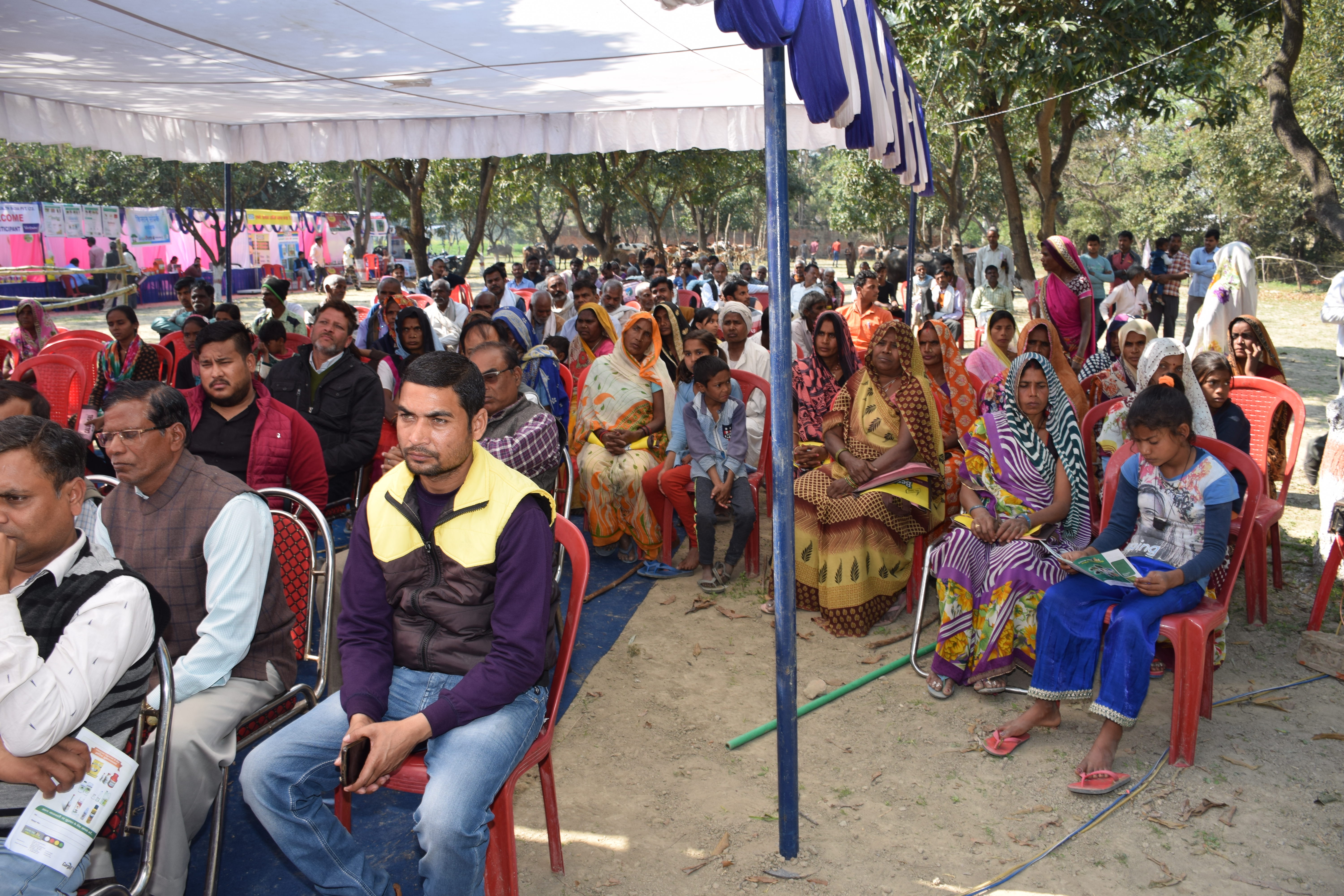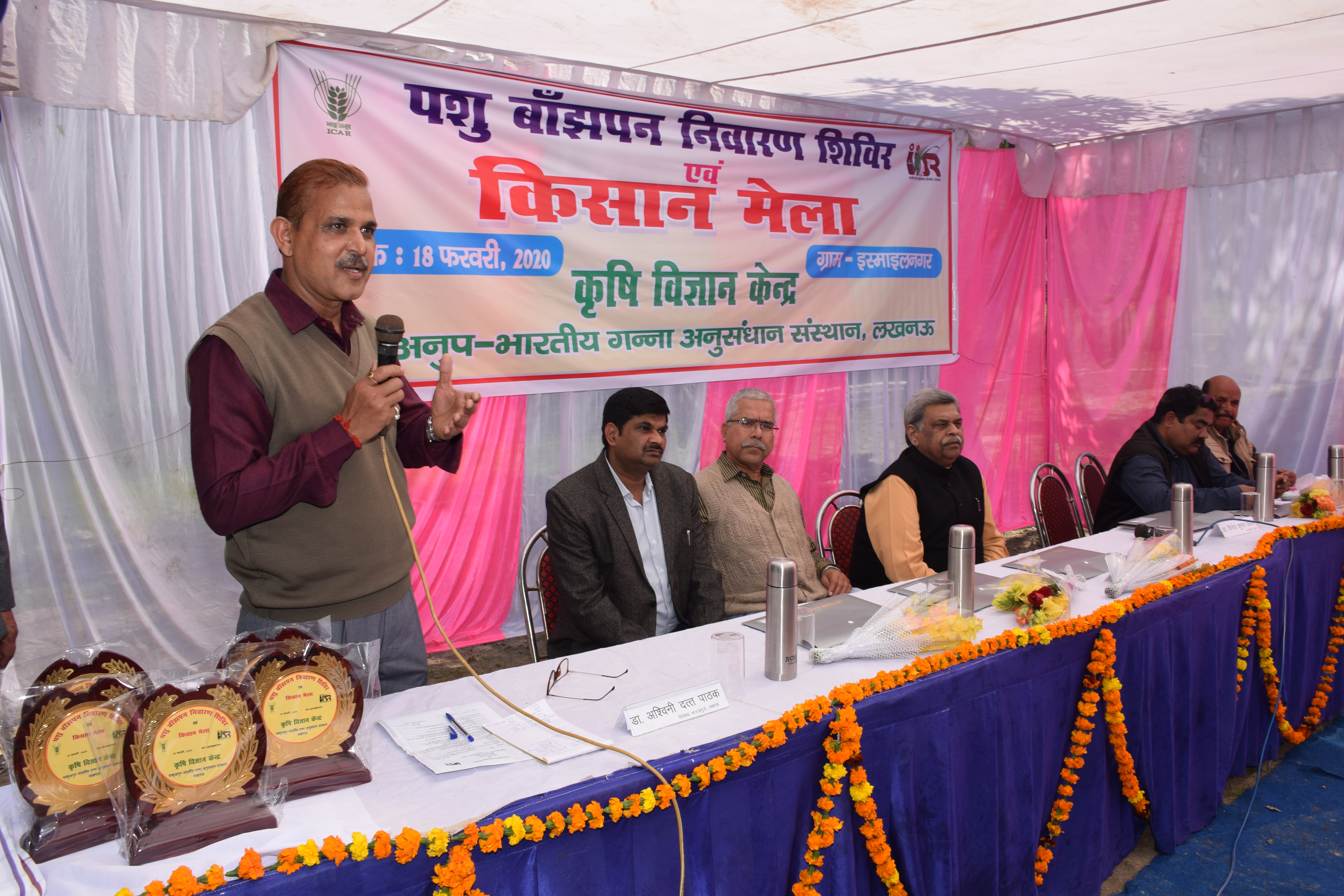 Krishi Vigyan Kendra, ICAR-Indian Institute of Sugarcane Research, Lucknow organized an Animal Fertility Camp at Ismailnagar, Nagram, Lucknow on February 18, 2020 which was attended by 365 dairy farmers and 260 animals of nearby villages for doubling the farmers’ income by increasing the productivity of dairy animals. On this occasion, Shri Umesh Singh Tomer, Chairman, Lucknow Milk Union, Lucknow Division was the Chief Guest of the programme, while Dr. A.D. Pathak, Director, ICAR-IISR, Lucknow presided the function. Total 260 livestock were medically tested for infertility and 100 kg mineral mixture, 2000 deworming tablets and medicine of ticks were distributed free of cost to the dairy owners. Dr. R.K. Singh, SMS (Animal Science) delivered a lecture on control of infertility in dairy animals and advised for balanced ration, deworming each animal at four months interval and advised farmers for green fodder/perennial fodder grasses production round the year. Three best cows and buffaloes were selected and their owners were awarded by Dr. A.D. Pathak, Director. The vote of thanks was proposed by Dr. A.K. Dubey, Head, KVK, ICAR-IISR, Lucknow.