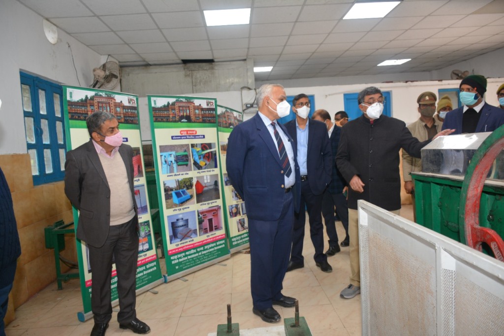 Hon’ble Chief Secretary, Uttar Pradesh, Sh. Durga Shankar Mishra, visited ICAR-Indian Institute of Sugarcane Research and its Krishi Vigyan Kendra, Lucknow. He was accompanied by Sh. Devesh Chaturvedi, Additional Chief Secretary, Agriculture, Govt. of Uttar Pradesh. Appreciating the efforts of IISR in research and on and off-campus training imparted to the farmers, Shri Mishra suggested that all the training programmes should be conducted in hybrid mode so that the farmers residing at distant places can also attend the training in virtual mode and accrue the benefits of training by increasing their farm income. He advised the Scientists to disseminate success stories of the progressive farmers through Facebook, WhatsApp and YouTube etc. Shri Mishra advised the Scientists of the Institute to make videos of various technologies and upload the same on YouTube for dissemination among the masses. Shri Mishra visited Farm Machinery Bank, Nursery raising Unit, Vermicompost, Dairy Unit, Vegetables Demonstration Unit, Nutrition Garden, Roof Top Gardening, Bee keeping Unit, mushroom production Unit and exhibition. He also visited the sites of Integrated Farming System Trial and Jaggery Unit of the Institute. He appreciated the work done at the Krishi Vigyan Kendra. At the outset, Dr. A.D. Pathak, Director, ICAR-Indian Institute of Sugarcane Research, Lucknow welcomed the Guests and narrated about the R & D achievements of the Institute. Dr. A.K. Dubey, Head, KVK, IISR, Lucknow and all the Subject Matter Specialists showed the various technologies at KVK to the visitors. Sh. Ashwini Kumar Pandey, Chief Development Officer, Lucknow; Dr. Vivek Singh, Director Agriculture, UP; Dy. Director (Agriculture), Dy. Director (Plant Protection), Dy. Director (Ag. Extension), District Agriculture Officer and other Senior Officers of U.P. Government and IISR, Lucknow were also present on this occasion.