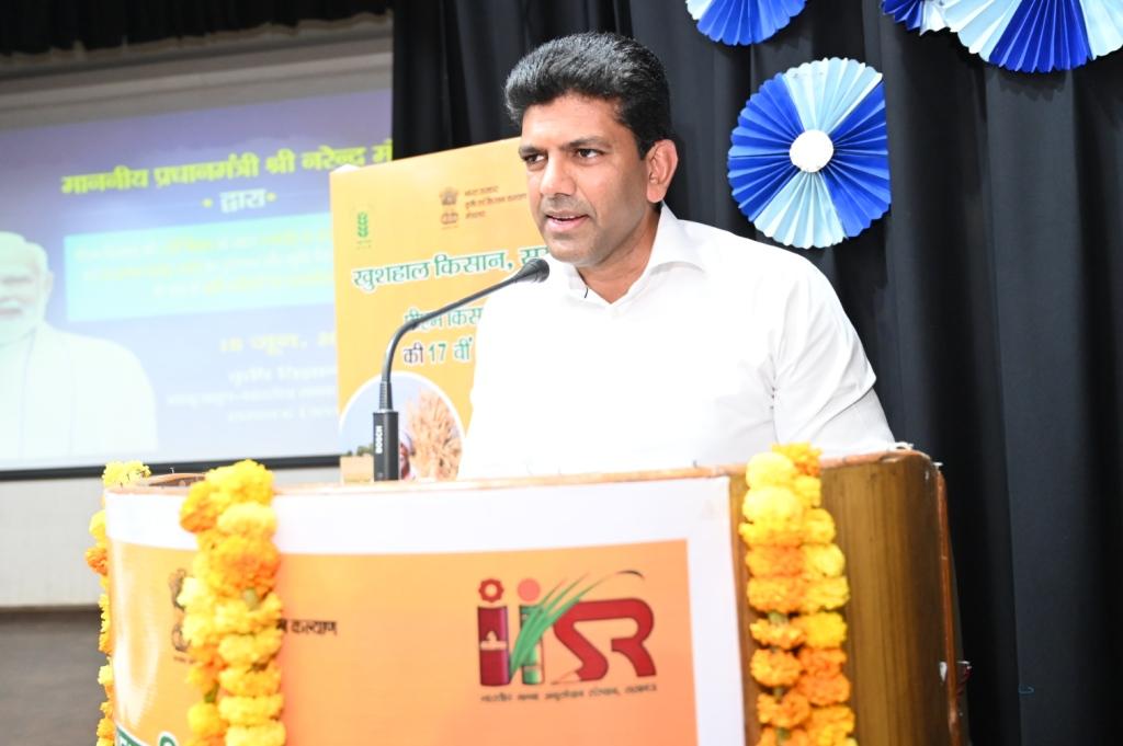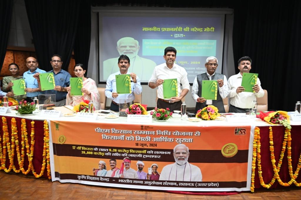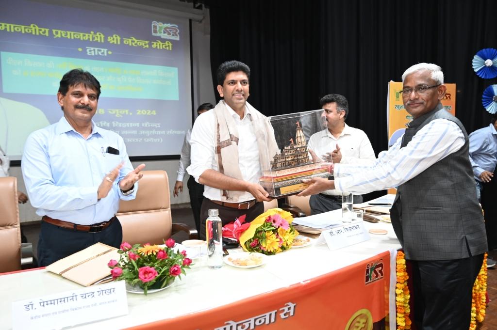 Hon'ble Dr. Pemmasani, Chandrashekhar Union Minister of State for Rural Development and Communication, Government of India presided over the live telecast program organized on the occasion of release of 17th installment of PM Kisan Samman Nidhi on 18/06/2024 at ICAR-Indian Institute of Sugarcane Research, Lucknow. Dr. U. S. Gautam, DDG (Agriculture Extension), Indian Council of Agricultural Research, New Delhi and Smt. Deeparanjan, Director, Rural Livelihood Mission, Gov. of UP were also present. On this occasion, Dr. R. Viswanathan, Director of the Institute, welcomed the guests by presenting mementos, anga vastra and bouquets. The programme was inaugurated by lighting of the lamp and ICAR song. The Director highlighted various aspects while briefing about the activities of Indian Institute of Sugarcane Research, Lucknow. Speaking on the occasion, Chief Guest Dr. Chandrashekhar Pemmasani informed that the Government of India had launched the PM-Kisan Samman Nidhi Scheme in 2019 for the planned development of farmers. Under this scheme, more than 11 crore farmers have been paid more than Rs. 3.04 lakh crore so far. And today certificates will be distributed to 30000 FPO / SHG farmer groups by the Hon'ble Prime Minister.